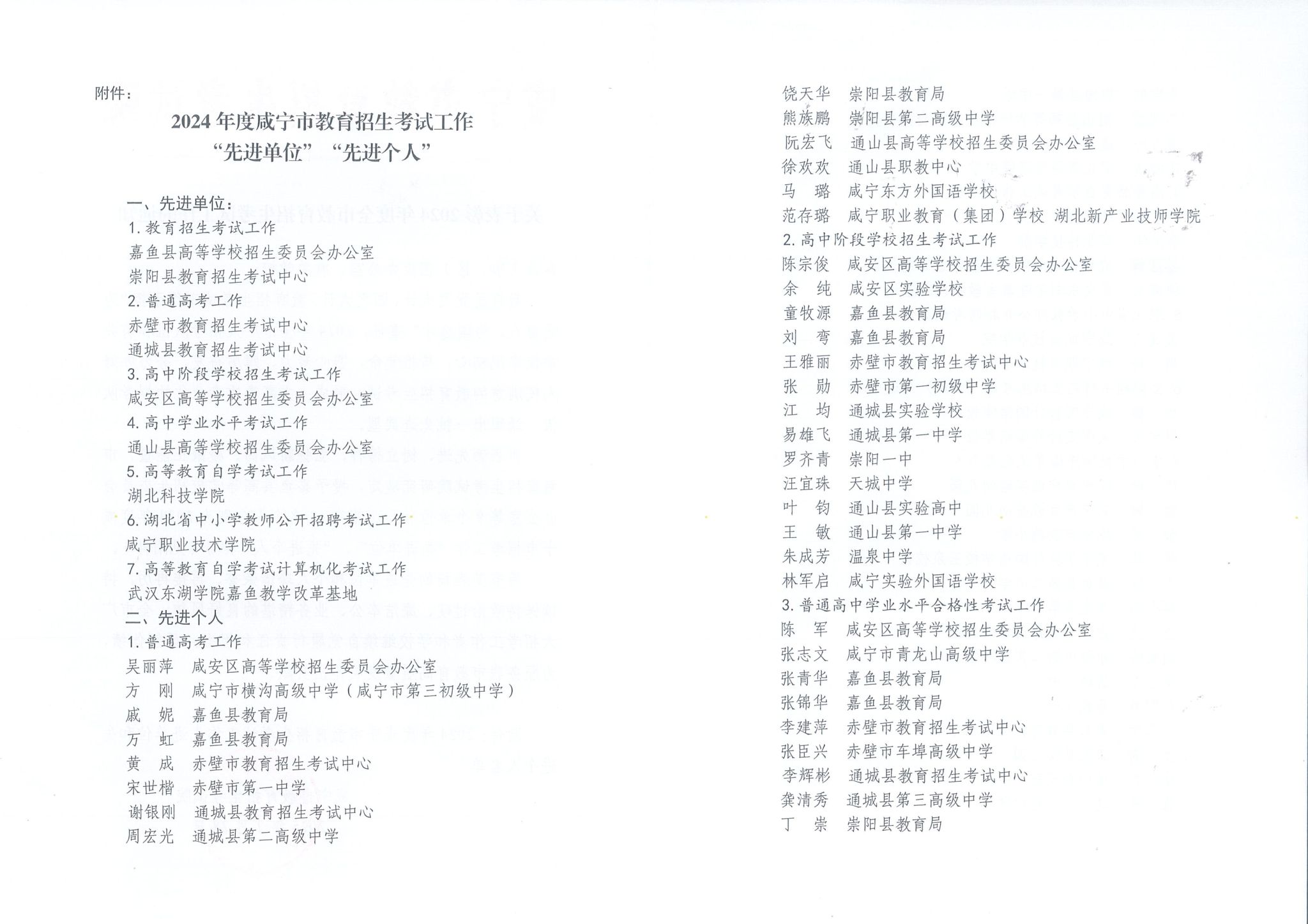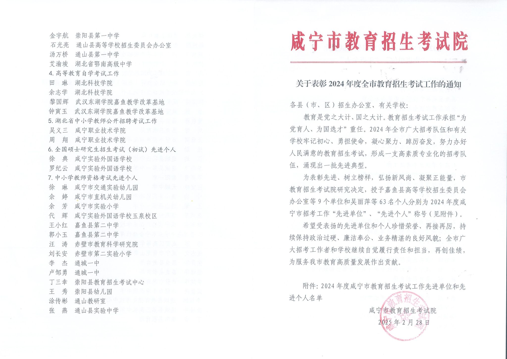近日,咸宁市招生考试办公室公布了《关于咸宁市2024年度教育招生考试工作及个人评价结果的通报》。开云凭借规范的管理、优质的服务和良好的考风考纪,获评市教育招生考试优秀考点,开云kaiyun体育吴义三、周翔同志获评优秀考务工作者。