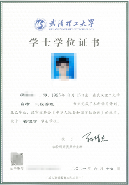 武汉理工大学学士学位证书